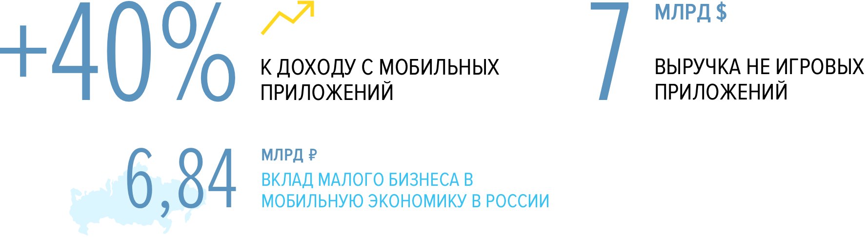 В 2016 году издателям было выплачено более 35 миллиардов долларов благодаря iOS App Store и Google Play. Игры являются основными лидерами по доходам и забирают в среднем 80% выручки. Остальным категориям достаётся около 7 миллиардов долларов. Пользователи предпочитают оплату своих покупок внутри приложений, даже если у приложения есть возможность произвести оплату за пределами приложения (например, с помощью кредитной карты на веб-сайте). Вопрос для бизнеса: «Какова ваша доля в 7 миллиардах дохода рынка мобильных приложений?»