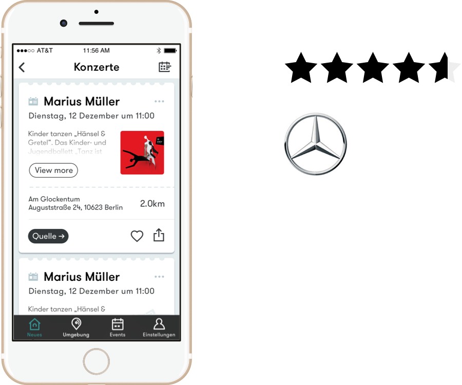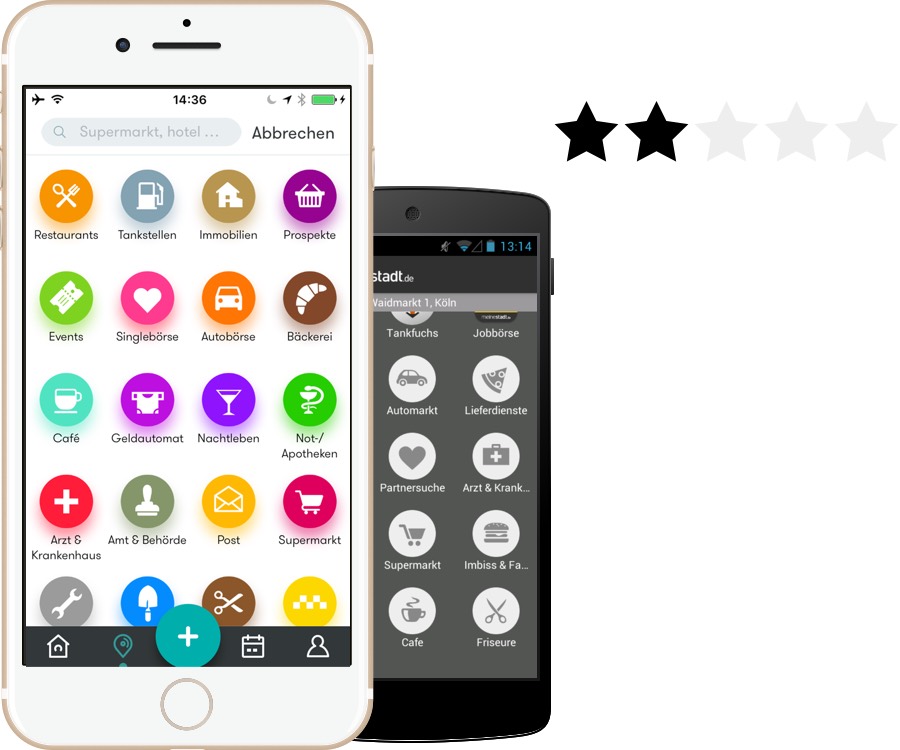 В 2017 году мы перезапустили мобильное приложение для немецкого гиперлокального медиа Meinestadt. Meinestadt App – это большой информационно-развлекательный проект с функционалом для поиска мероприятий, кафе, заправок, арендного жилья и других объектов. Сегодня приложение установлено каждым восьмым жителем Германии.