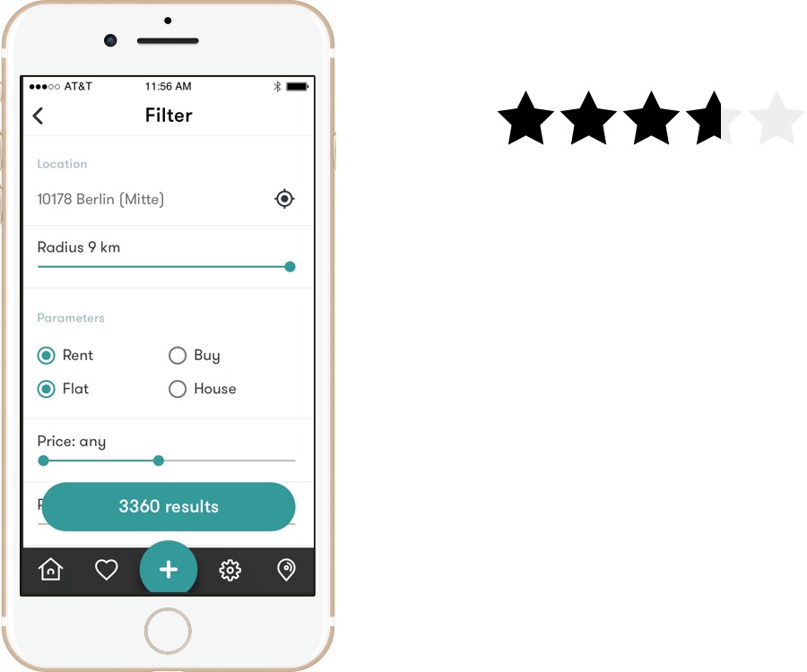 Системы аналитики дают всё новые данные. Люди интересуются разделом подбора арендной недвижимости (он интегрирован с партнерским сервисом), но не совершают там достаточное количество целевых действий (отправка заявки в сервис аренды жилья). Мы полностью переработали дизайн раздела, целевых действий стало больше, а среднемесячная оценка приложения изменилась с 2 звезд до 3,75.